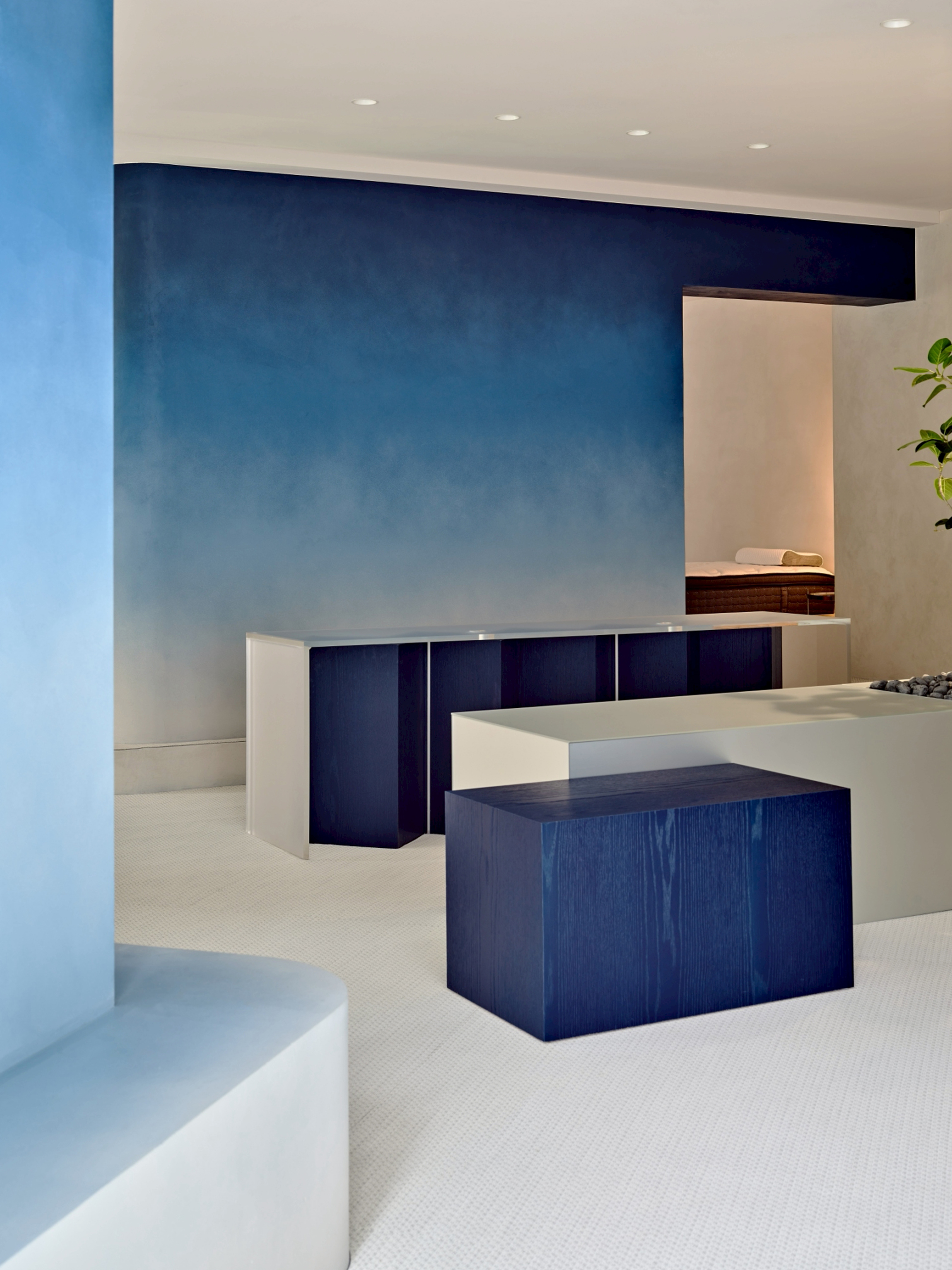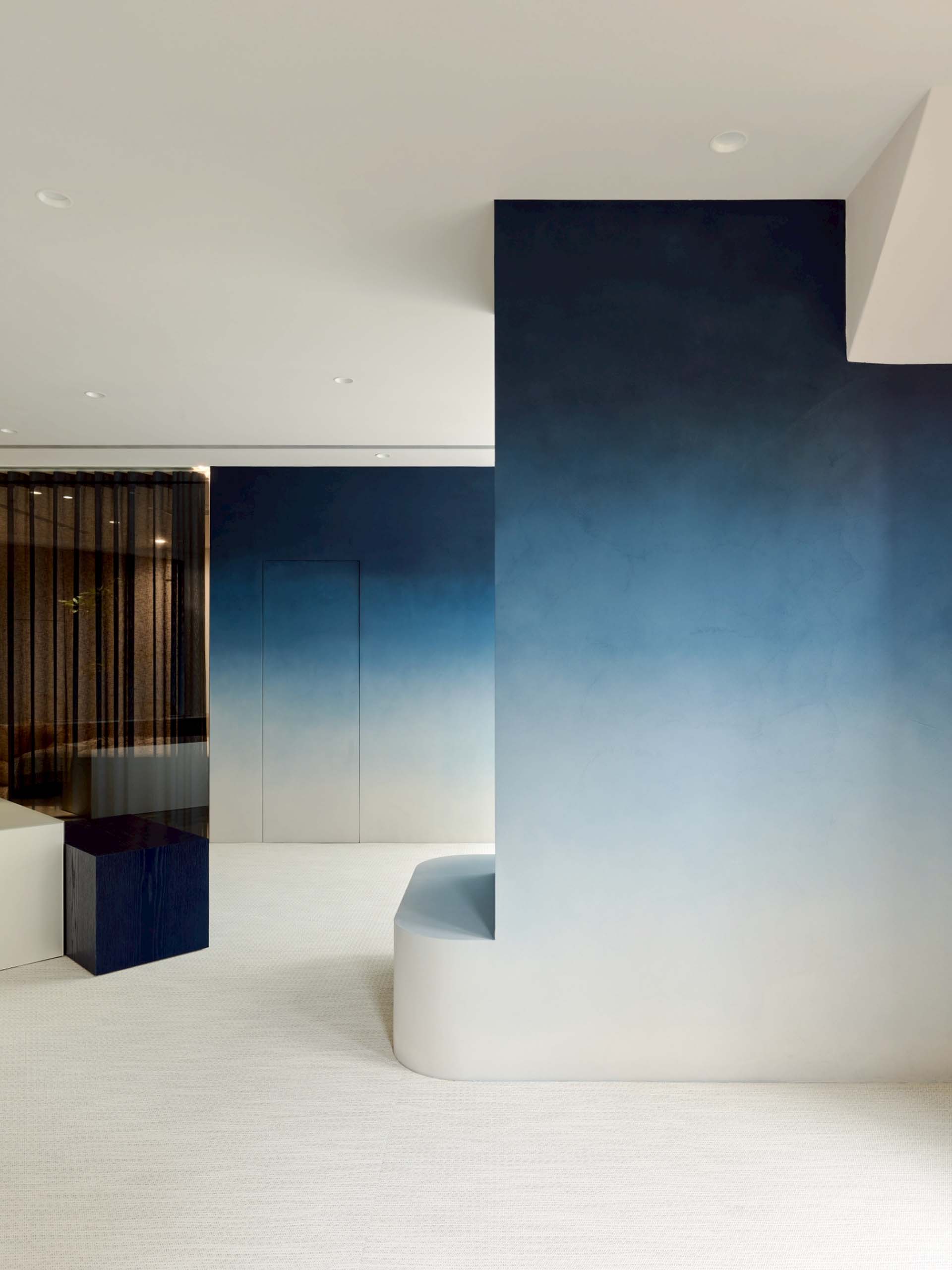像晨光踏進空間,藍色輕柔地向白色退去,邊界模糊而安靜,