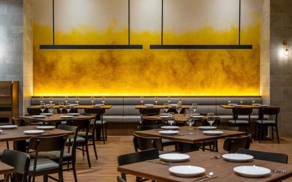 用鮮豔飽暖的黃色,將窯燒轉化成牆壁的飾面,